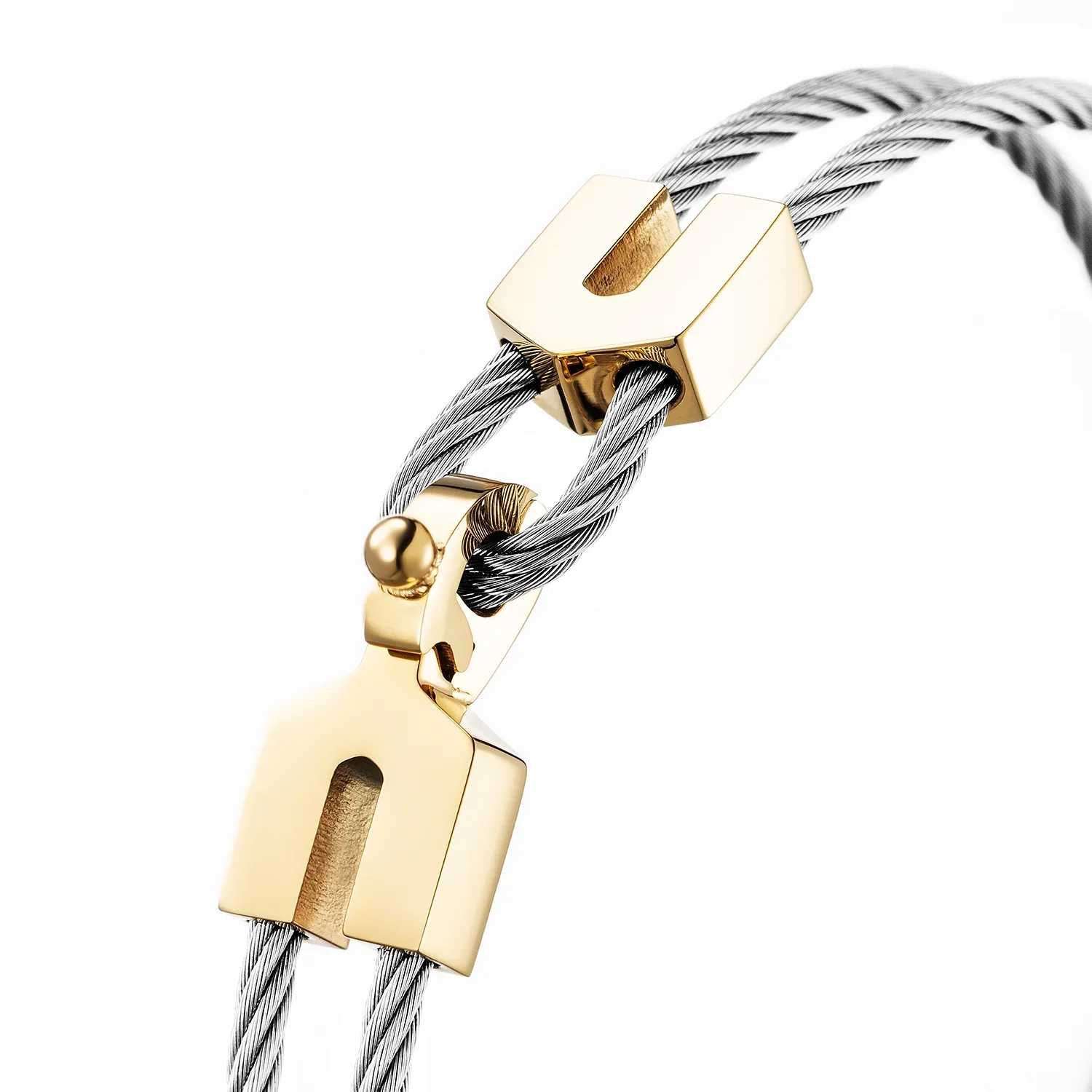 Two stylized magnets (9.5mm by 8.6mm) in steel are connected and secured by a discreet clasp on a 2mm diameter black PVD steel cable loop. Coup de Foudre captures the spark of an instant connection, an infinite loop of twisted cable expressing the unshakable force of Cupid’s arrow. The combination captures the duality inherent in the experience of early love; his and hers, yin and yang, a polarity that expresses the immediate magnetism of love at first sight.